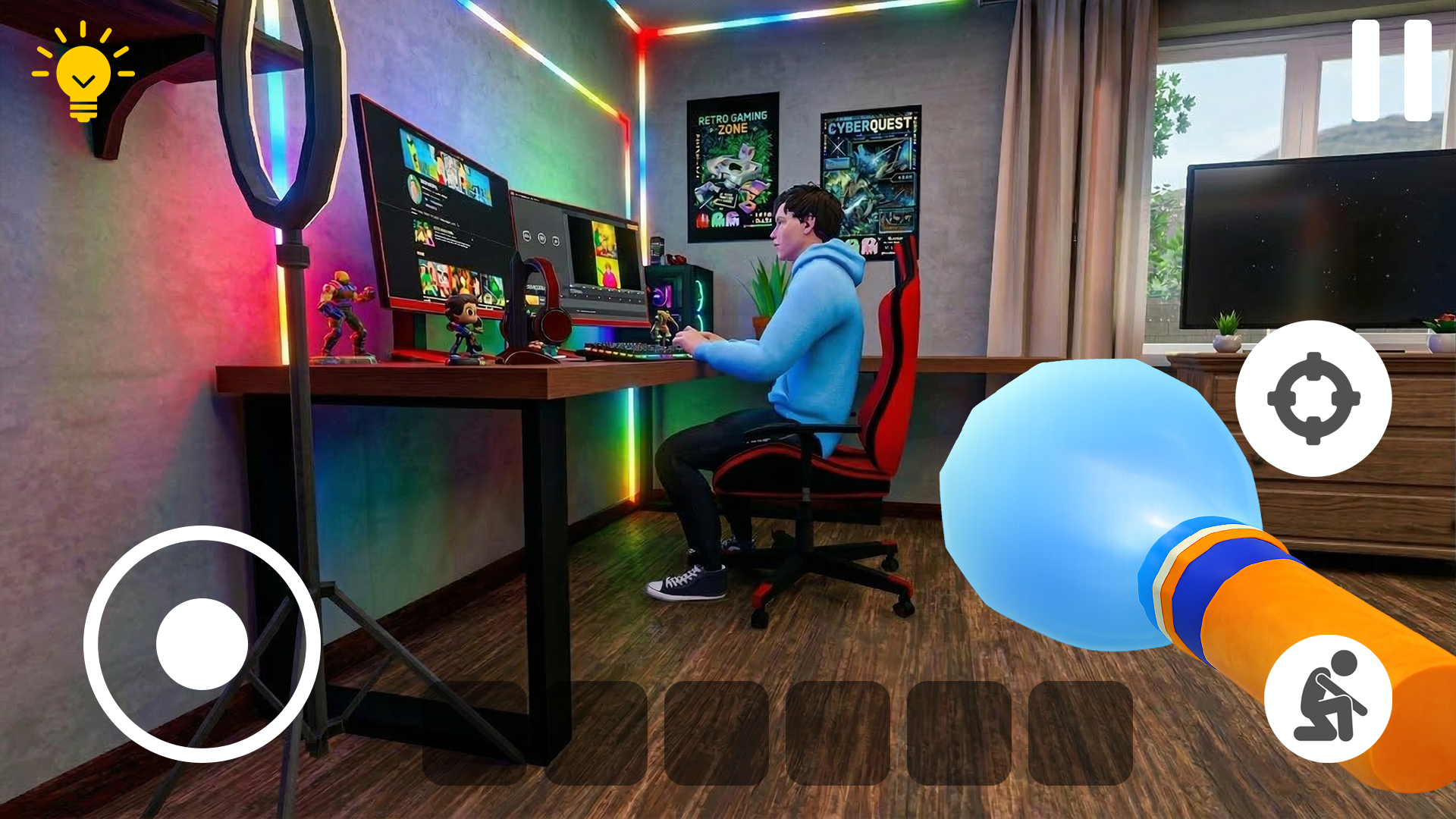 Геймплей строится вокруг исследования жутких комнат, каждая из которых представляет собой головоломку в стиле квест-комнат. Чтобы продвигаться дальше, вам нужно искать полезные предметы, открывать двери, взаимодействовать со скрытыми механизмами и решать логические задачи. При этом вам постоянно нужно избегать встречи с блогером, который патрулирует дом и реагирует на любой шум. Игровой процесс сочетает элементы приключений, экшена и головоломок, а темп динамичный: спокойные моменты исследования сменяются тревожными погонями или попытками укрыться.